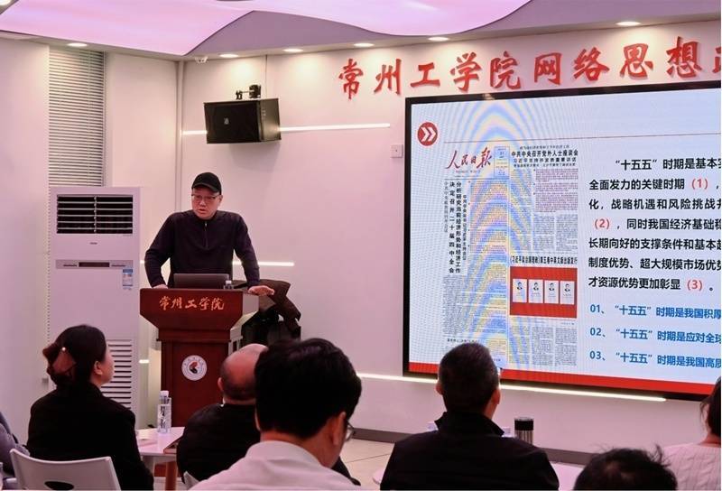 随后,常州工学院“常小燕”大学生理论宣讲团以《因地制宜发展新质生产力的常州答卷》为题,围绕科技突破、产业转型、人才支撑等方面,生动宣讲了常州在推动高质量发展过程中的创新实践与扎实成效。常州工学院马克思主义学院教授张建进行《深入学习贯彻党的二十届四中全会精神》专题授课,系统阐述了全会精神的核心要义与实践要求,并结合当前形势与基层党建实际,对如何将理论学习转化为推动学习和工作的强大动力进行了深入浅出的解读。