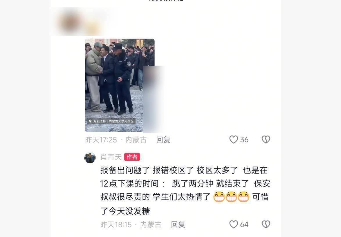 极目新闻记者注意到,博主肖青天近段时间连续更新了多条在高校即兴舞蹈表演的视频,受到同学们欢迎,还有学生留言欢迎他来自己学校。16日下午,肖青天在评论区回复网友称,自己当天报备出问题了,因为内蒙古大学校区太多,他报错校区了,“保安叔叔很尽责,学生们太热情了,可惜当天没发糖。”