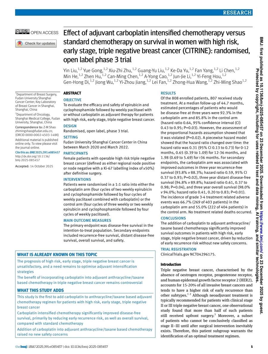 北京时间12月23日18时,国际四大医学顶刊之一《英国医学杂志》(BMJ)在线发表一项由复旦大学附属肿瘤医院乳腺外科邵志敏教授领衔团队完成的CITRINE III期临床研究成果,影响因子42.7分。该研究旨在打破最具复发风险的早期三阴性乳腺癌高危患者“千人一面”的治疗困局,临床研究发现,试验组方案在标准治疗的基础上,加入卡铂药物进行强化治疗,患者3年无病生存率达到92.3%,降低复发风险36%,显著优于对照组,为全球早期三阴性乳腺癌患者精准治疗提供了“中国方案”。